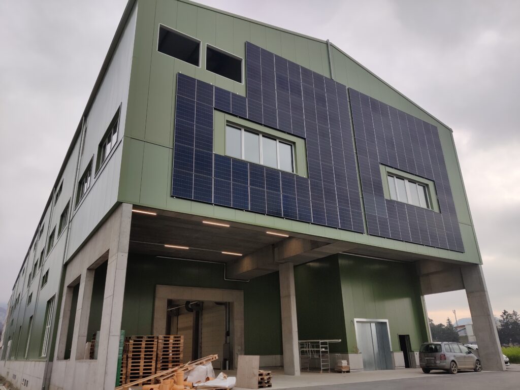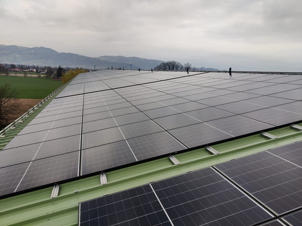 Mit dem Neubau 2024 haben wir wiederum eine neue zusätzliche Photovoltaik-Anlage in Betrieb genommen. Bei dieser neuen Anlage befindet sich auch ein Teil der Panels an der Fassade. Die gesamte Photovoltaik-Anlage am Standort Werkstrasse hat eine Maximalleistung von 591 kWp.